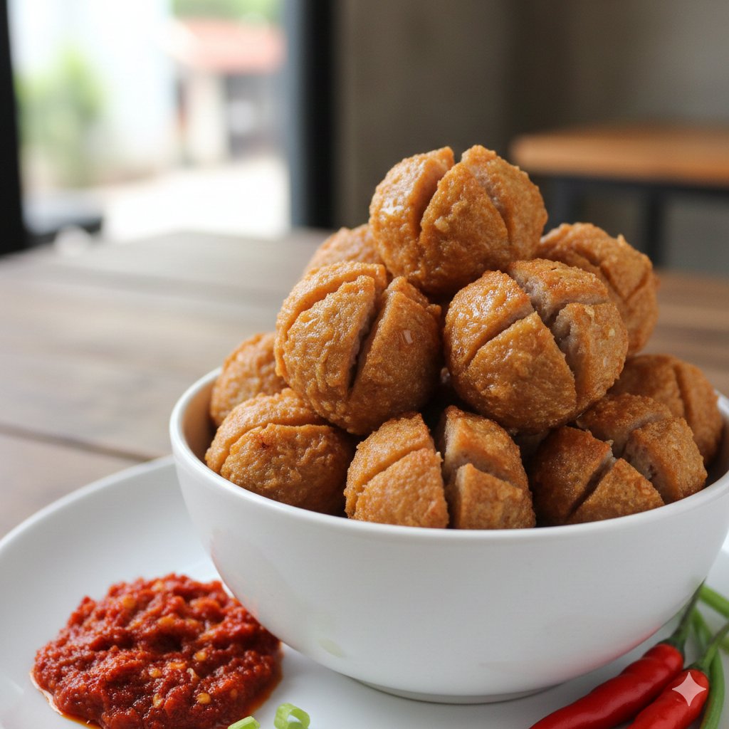 Perpaduan bakso goreng yang renyah dengan sambal pedas gurih menjadikan camilan ini cocok disantap saat bersantai, termasuk ketika menyaksikan laga panas Persib Bandung melawan Persija Jakarta.