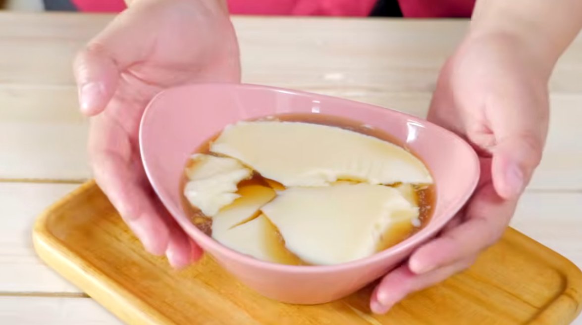 Sajikan kembang tahu dalam mangkuk, lalu tuang kuah jahe perlahan agar kembang tahu tidak hancur.