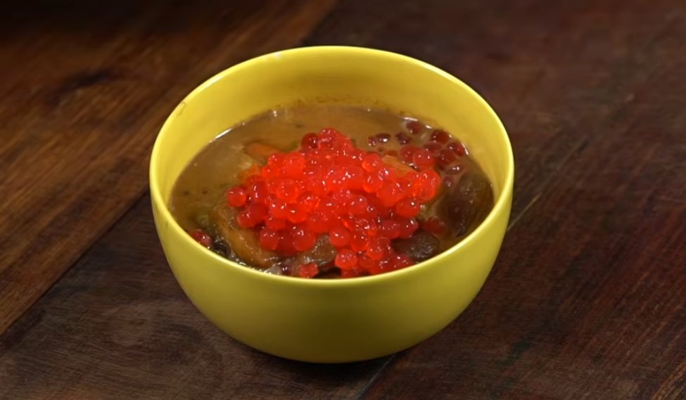 Siapkan mangkuk saji, ambil isian kolak dan sagu mutiara, lalu tuang kuahnya. Hias dengan daun pandan.