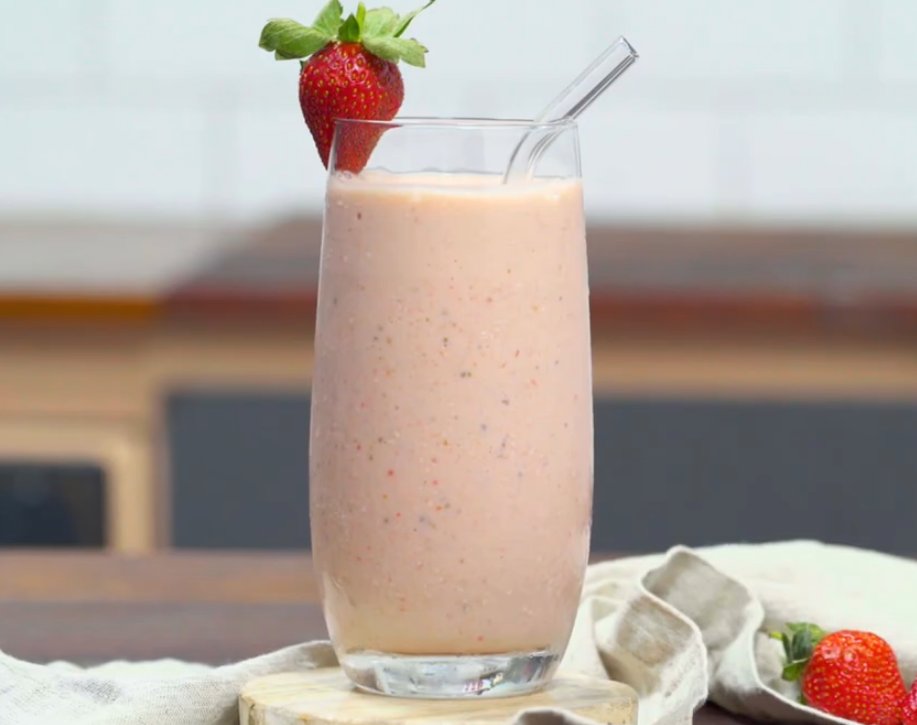 Smoothies ini cocok dinikmati sebagai menu sarapan, bekal setelah olahraga, atau camilan sehat di sela aktivitas. Penyajiannya pun bisa dipercantik dengan topping stroberi beku dan taburan chia seeds agar tampil lebih menggugah selera.